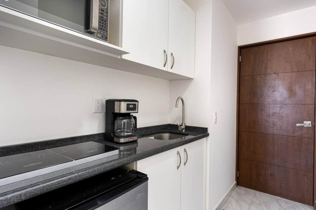 Coffee machine, Cooking utensils, Kitchen stove, Kitchenette, Microwave, Oven, Refrigerator