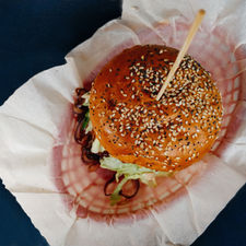 Top sirlein hamburguers or hot dogs, fries and complements.
